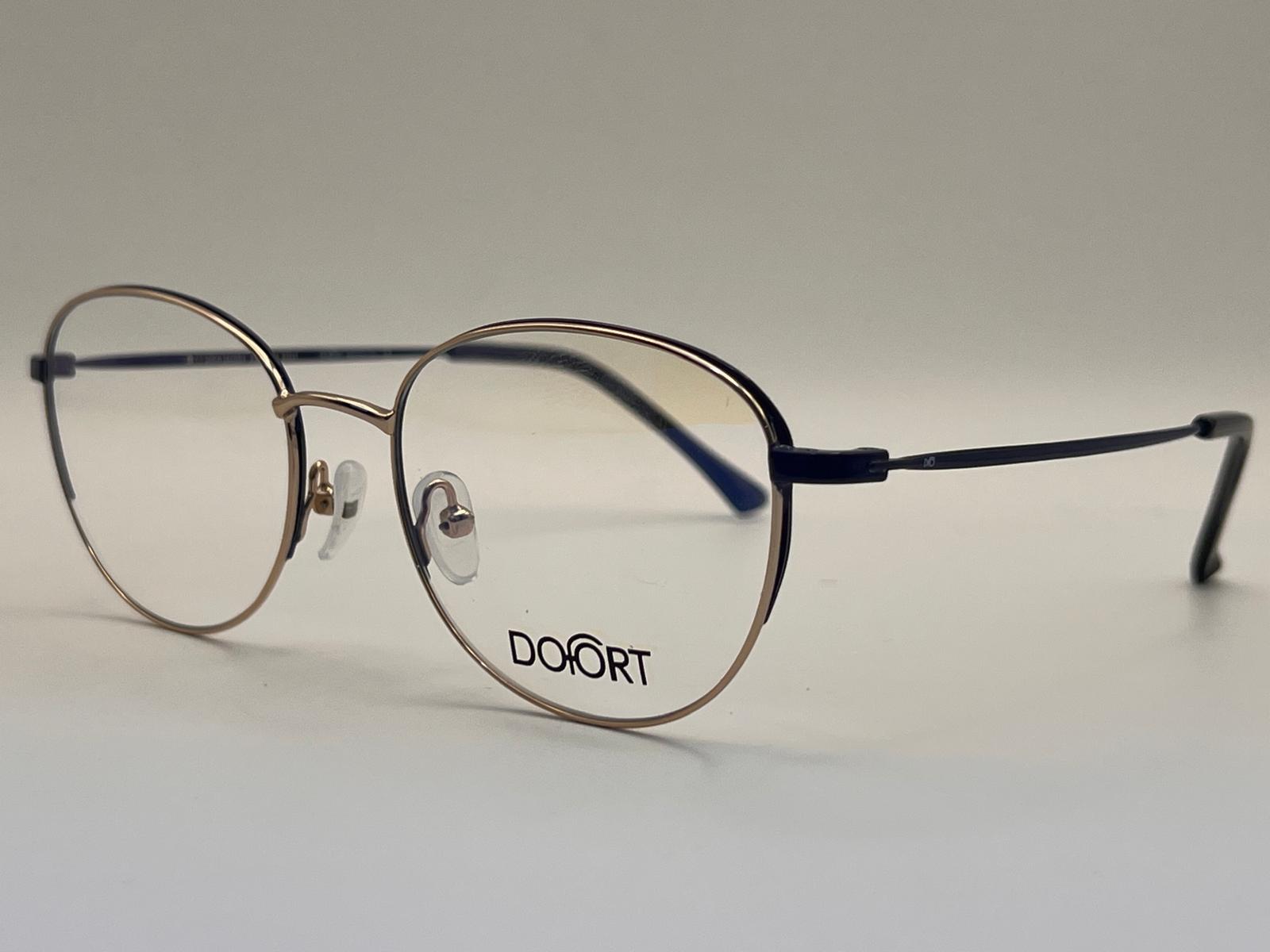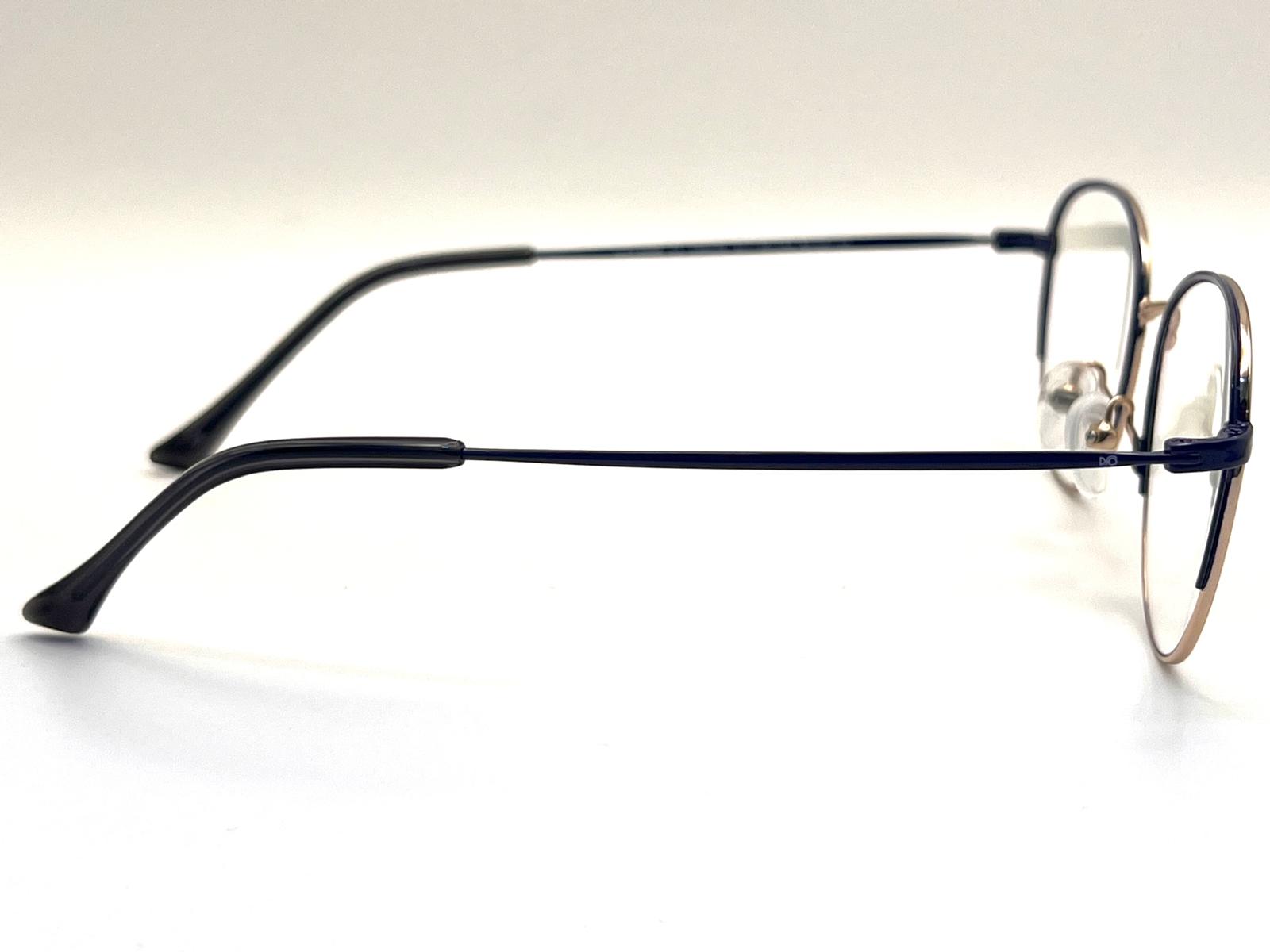 الإطار الأمامي، الجزء السفلي من العدسات محاط بإطار رفيع ذهبي، والجزء العلوي من الإطار وأكمل الأذرع باللون الأزرق البحري الداكن.